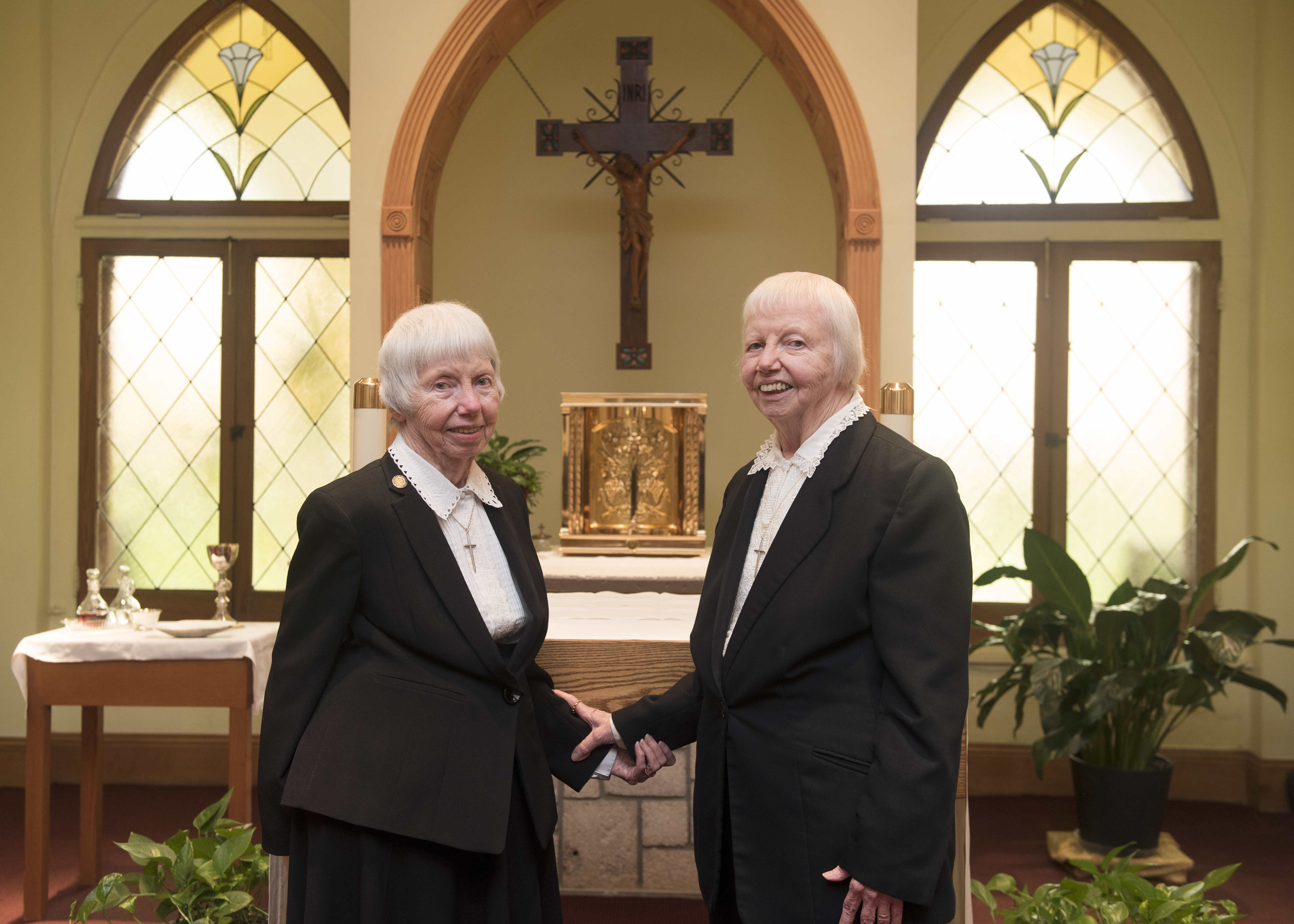Twin sisters, Sister Loyce Newton and Sister Joyce Newton, stand together on Thursday, October 19, 2017 in the chapel of the Sisters of St. Joseph Motherhouse, where they live together as nuns in Our Lady of Lourdes Convent. (Christina Kelso/ The St. Augustine Record)