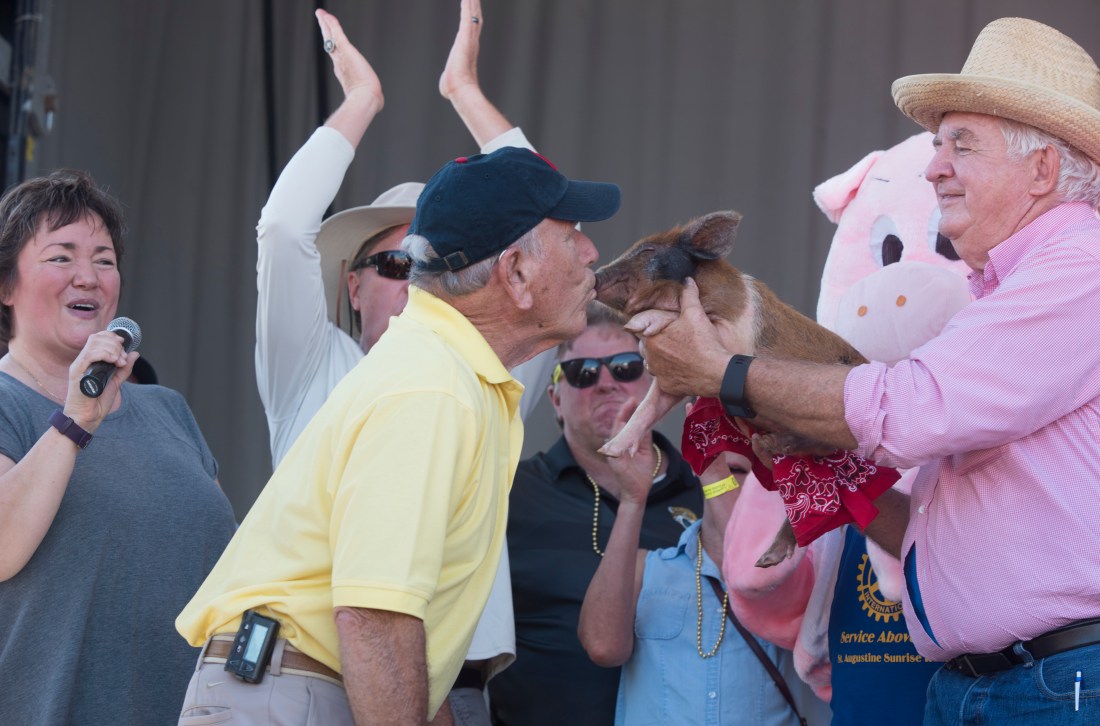 Winner of Learn to Read St. Johns County’s Kiss the Pig contest Rick Ezequelle smooches Wilber the piglet on the snout during the Rhythm and Ribs festival at Francis Field on Saturday, April 1, 2017. (Christina Kelso/ The St. Augustine Record)