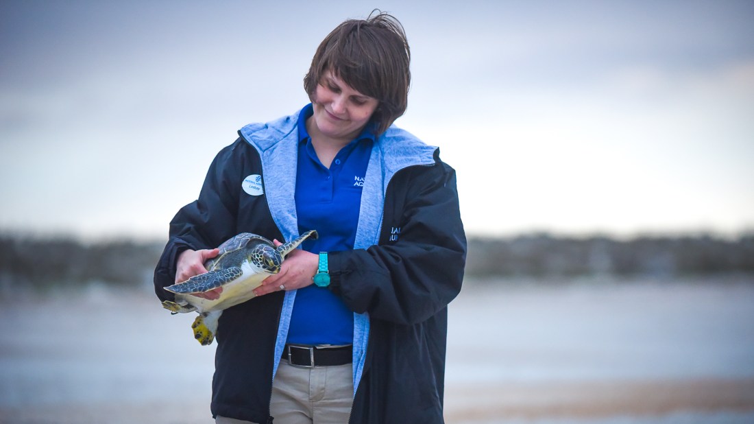 National Aquarium Animal Rescue team member Lindsay Jacks, prepares to release one of 19 rehabilitated sea turtles who washed up with symptoms of cold stunning in New England, at Anastasia State Park on Thursday, January 27, 2017. (Christina Kelso/ The St. Augustine Record)