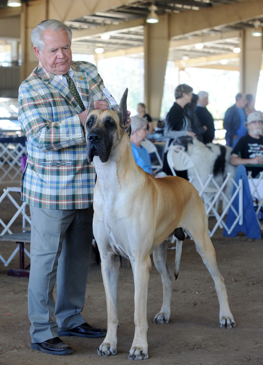 Doug Toomey from North Carolina shows Great Dane Odin in the first day of the Greater Orange Park Dog Club All-Breed Dog Show on Saturday, April 8, 2017. Odin won a first place blue ribbon in the Working Group competition. More than 850 dogs are competing in the weekend event, which continues today from 8:00 a.m. to 5:00 p.m. Admission is free for spectators. Parking is $5.00 per vehicle. (Christina Kelso/ The St. Augustine Record)