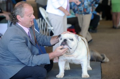 Dan Zemke prepares five-year-old English Bulldog Francis for judging during the Greater Orange Park Dog Club All-Breed Dog Show on Saturday, April 8, 2017. (Christina Kelso/ The St. Augustine Record)
