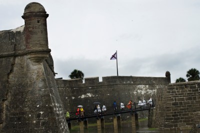 Shielding themselves with ponchos and umbrellas, a line of visitors crosses into the Castillo de San Marcos during a rainstorm on Tuesday, June 6, 2017. (Christina Kelso/ The St. Augustine Record)