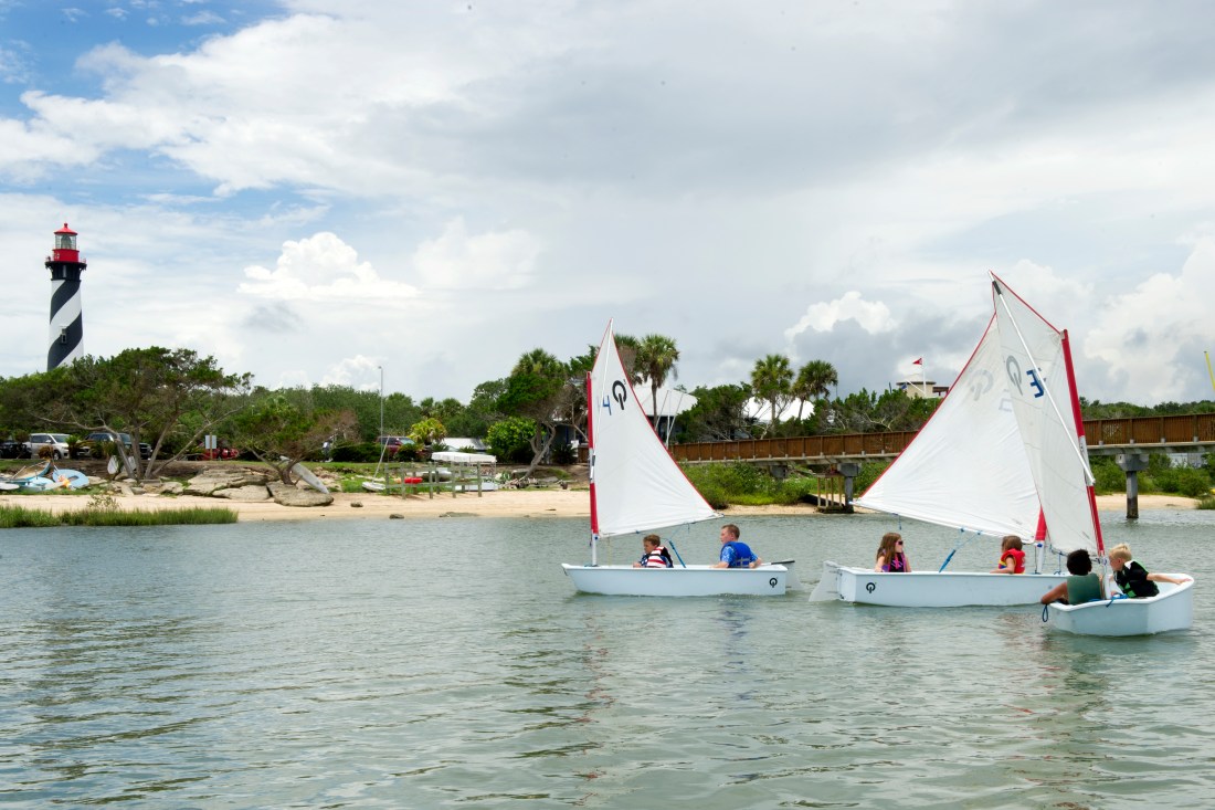 Children sail across Salt Run near Lighthouse Park on Tuesday, June 13, 2017, while participating in the St. Augustine Yacht Club’s summer Junior Sailing Camp. Sailors, ages 7 to 15, spend a week learning the sport in the hands-on program, which started on Memorial Day and runs through early August. (Christina Kelso/ The St. Augustine Record)