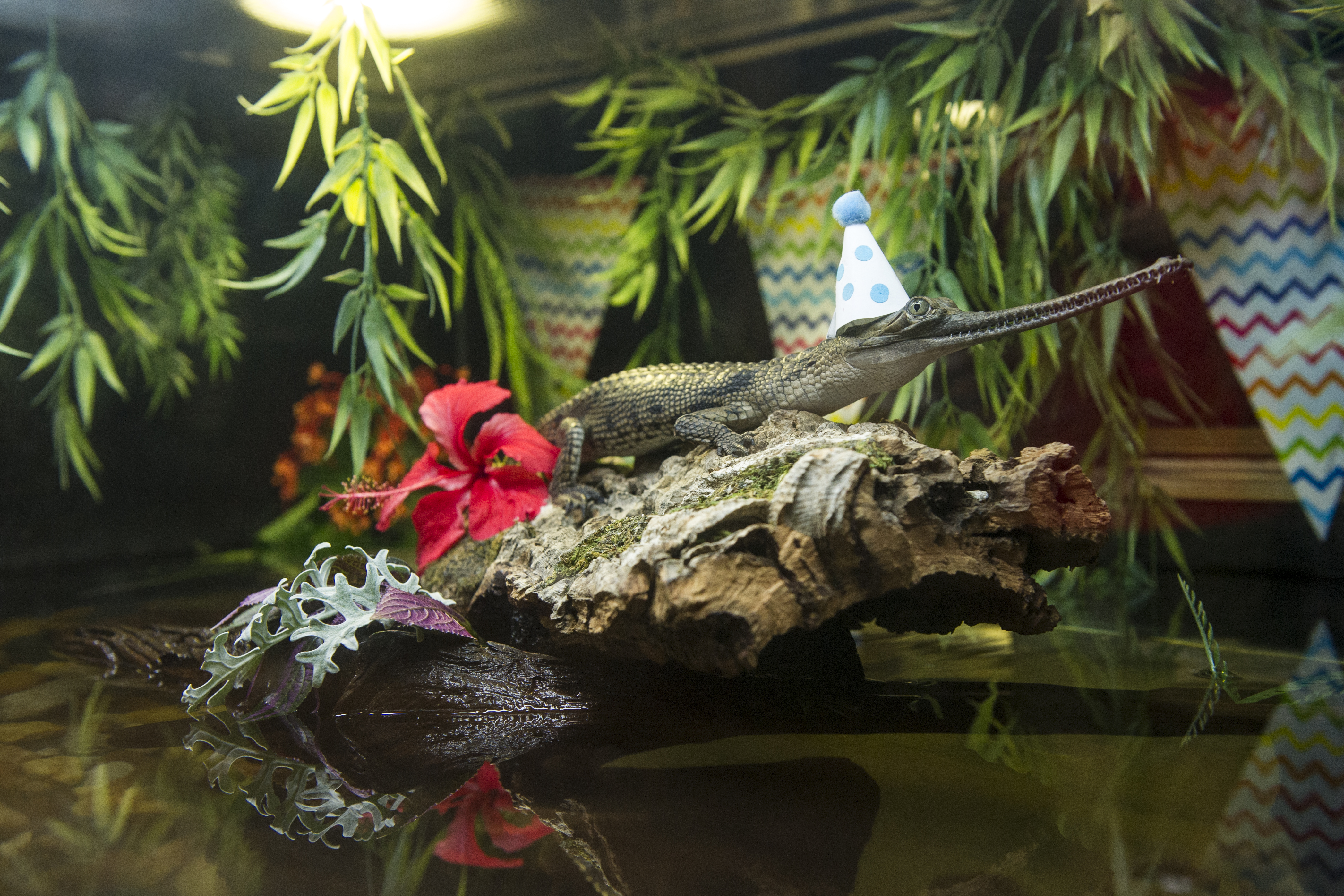 The St. Augustine Alligator Farm Zoological Park celebrated the first birthday of their male Indian gharial hatchling, Makara, on Monday, June 12, 2017. A critically endangered species of crocodile native to south Asia, Makara’s 2016 birth at the Alligator Farm marked the first successful hatching of an Indian gharial in captivity outside of India or Nepal. A difficult animal to breed it captivity, his birth was an accomplishment that the zoo worked towards for more than two decades, since 1991. Makara is 26 inches long, having doubled from 13 inches at hatch, and is expected to grow to be approximately 13 to 15 feet. He is pictured standing inside of his enclosure on Monday with a miniature birthday hat balanced briefly on his head. Makara shared his birthday celebration with six baby Galapagos tortoises. The tortoises, who began hatching on the same day, were the first of the endangered species to be bred at the Alligator Farm. (Christina Kelso/ The St. Augustine Record)
