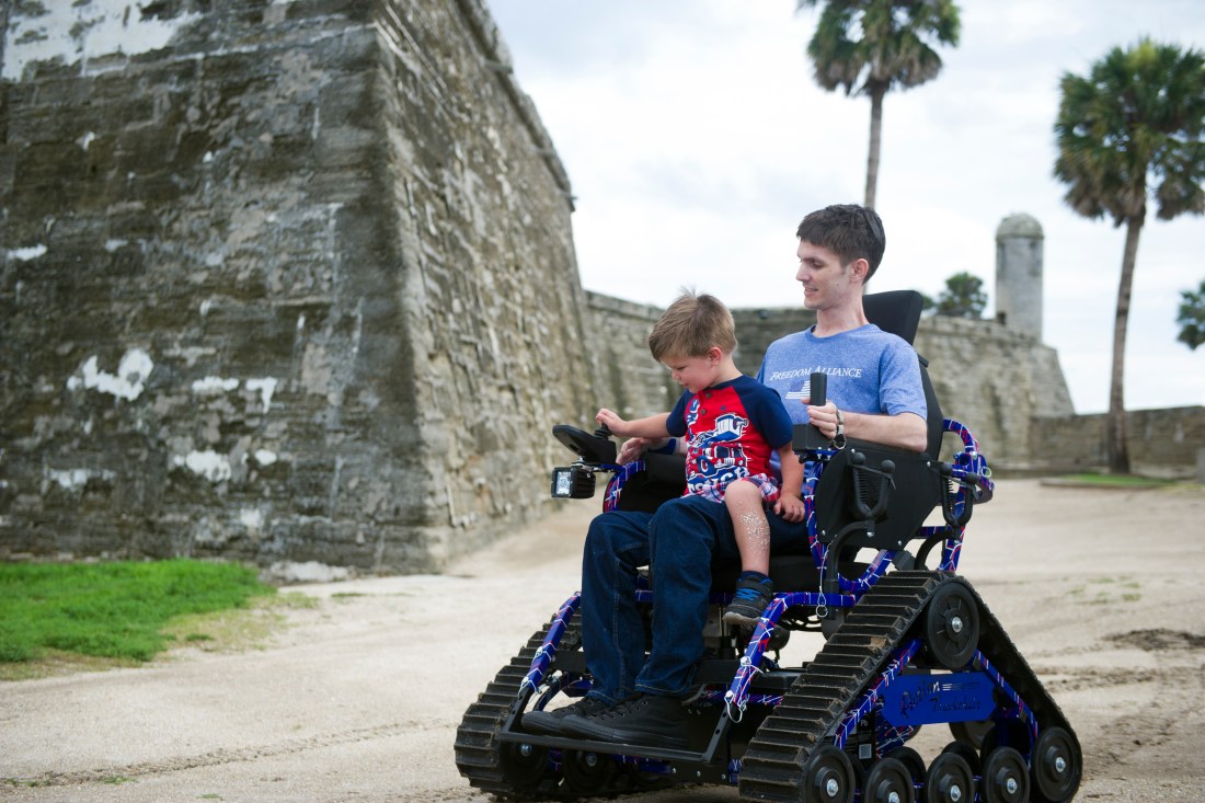 Toddler Rhett Natto, son of local U.S. Marine veteran Chris Natto, sits on his father’s lap to steer his new all-terrain wheelchair around the grounds of the Castillo de San Marcos on Wednesday, June 28 2017. Chris Natto, who was partially paralyzed in a parachute accident during a Feb. 2016 training exercise at Fort Bragg, was presented with the chair on Wednesday by Freedom Alliance, a national organization supporting American military veterans and their families. The chair is designed to provide Natto the mobility needed to more easily join his family in outdoor adventures, such as beach visits and trail walking. (Christina Kelso/ The St. Augustine Record)