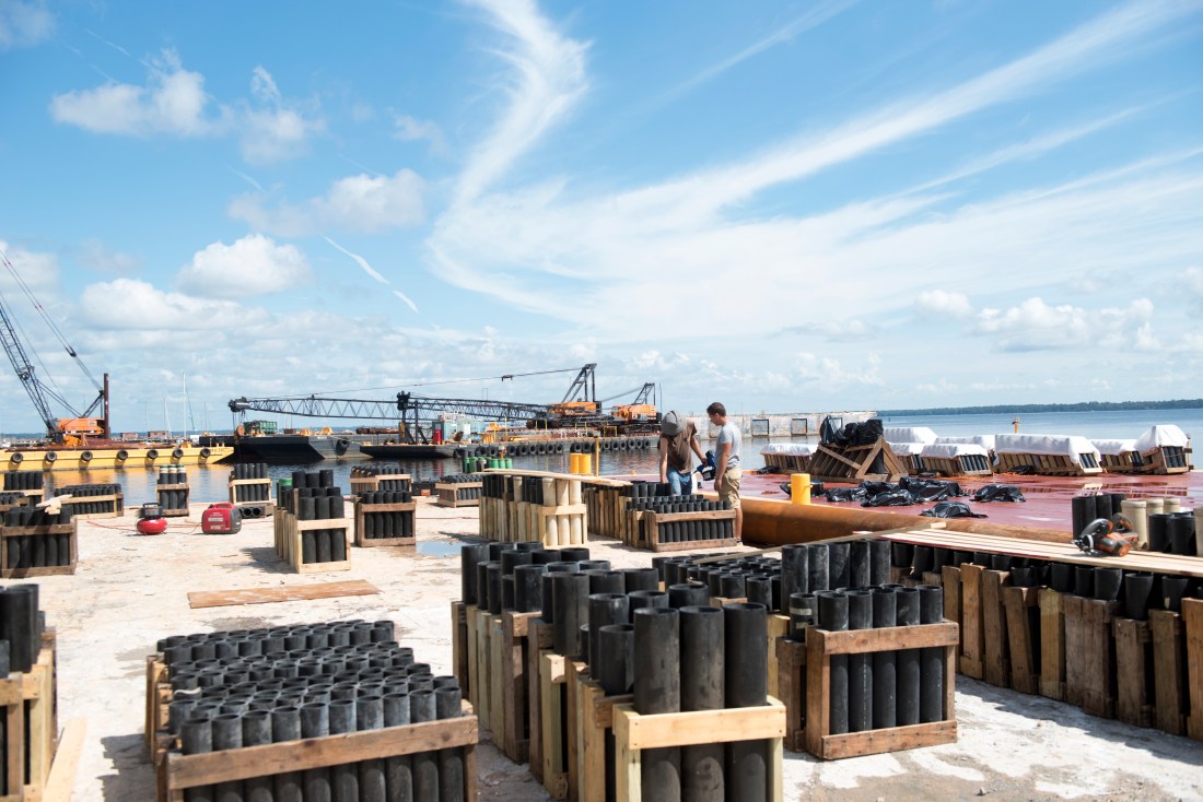 Ethan Flores and Eli Keeler with Fireworks by Santore load fireworks onto a barge destined for a Fourth of July show in Ormond Beach, adjacent to another barge with the finished fireworks display set-up for St. Augustine’s show, at MOBRO Marine in Green Cove Springs on Friday, June 30, 2017. (Christina Kelso/ The St. Augustine Record)