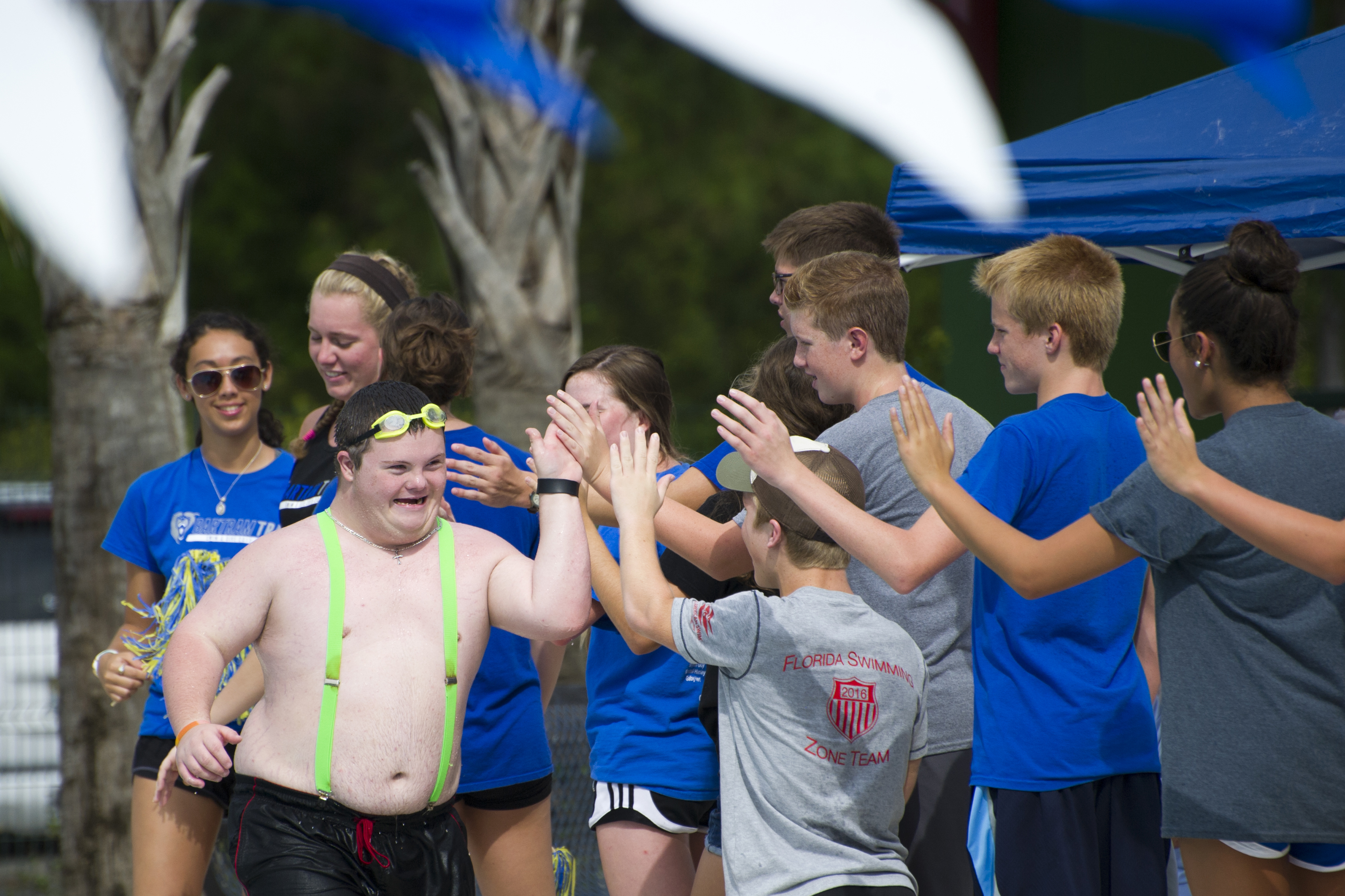 Fifteen-year-old Kevin Harrison high-fives a cheering line of fans on Saturday, August 5, 2017, after competing in the St. Johns County Special Olympics Swimming Competition at the Solomon Calhoun Center. Twenty county athletes, from nine-years-old to adult, participated in the fifth annual event. Under the team name, the “St. Johns Splash,” the athletes have trained together for the competition since June. (Christina Kelso/ The St. Augustine Record)