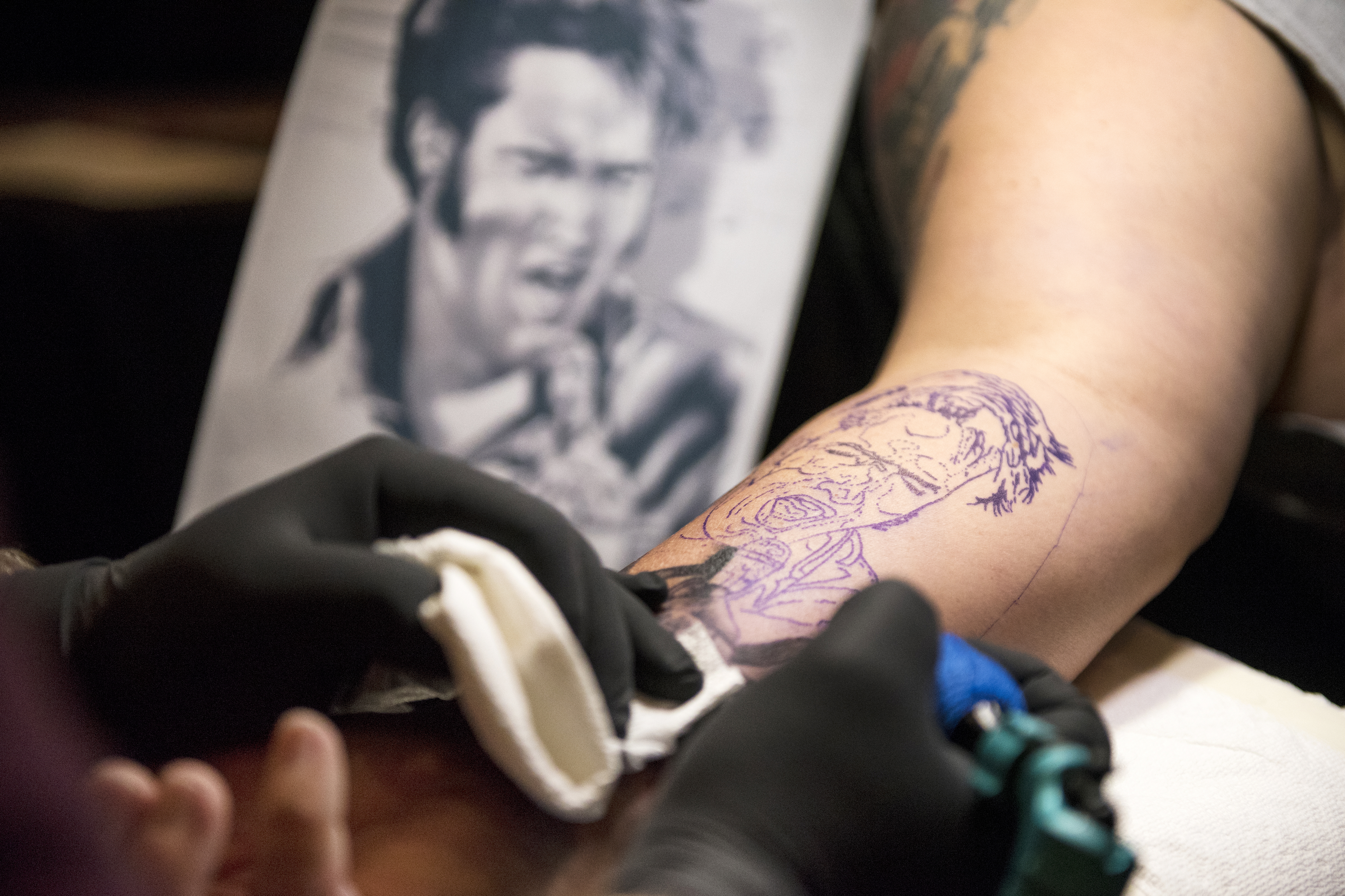 Artist Eric Newby of Ink Expressions in Chattanooga, Tennessee inks an Elvis Presley tribute tattoo onto Tommy Johnson from Jacksonville at the 2017 Jacksonville Tattoo Convention on Saturday, August 26, 2017. (Christina Kelso/ The St. Augustine Record)