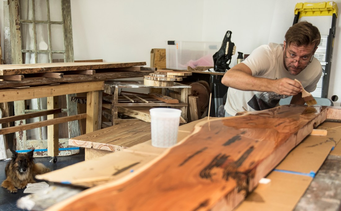 Austin Weeks, founder of Old Town Timber, works in his St. Augustine Beach studio on Saturday, September 23, 2017, brushing glaze onto a custom mantel made from a red cedar tree brought down by Hurricane Matthew in October 2016. (Christina Kelso/ The St. Augustine Record)