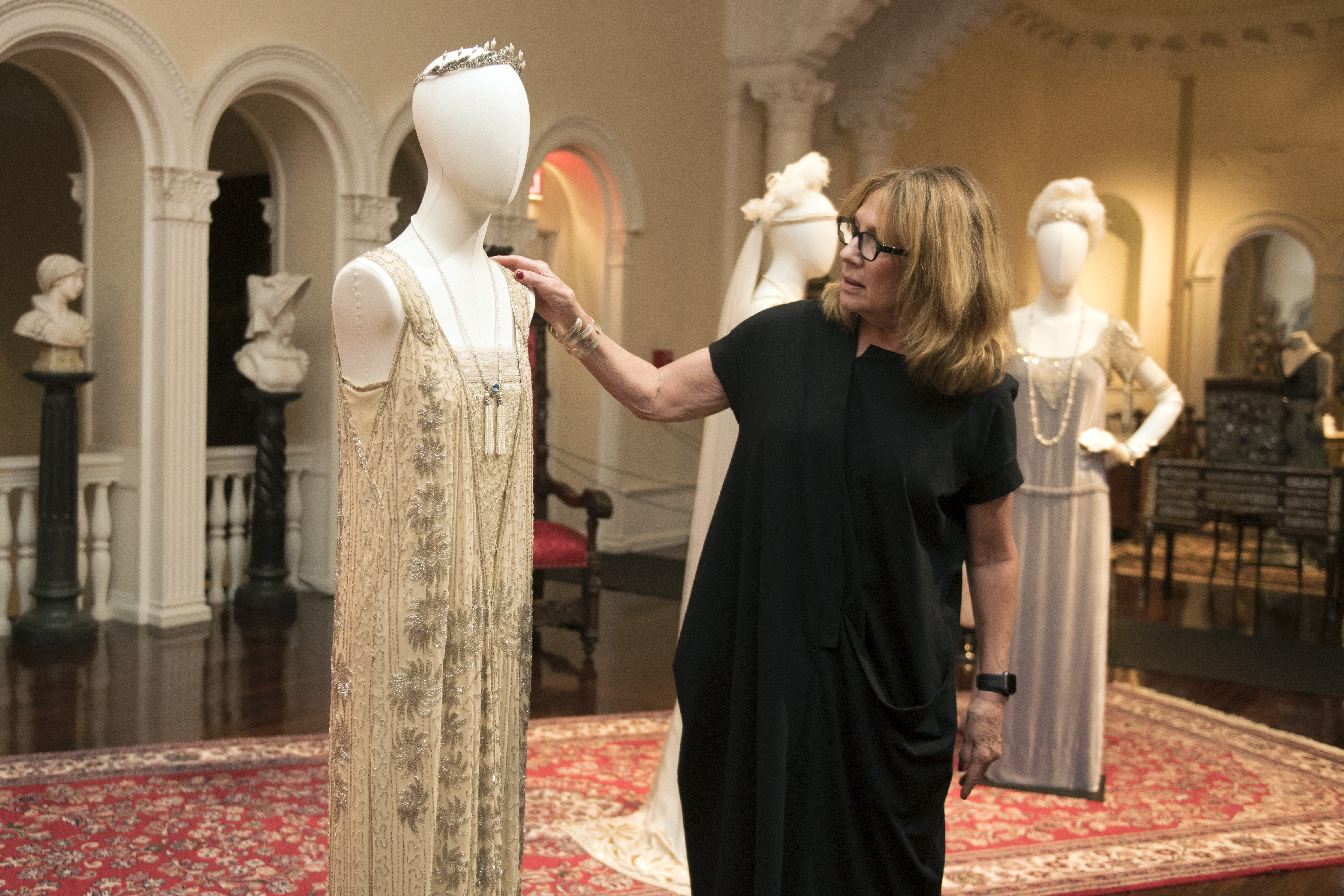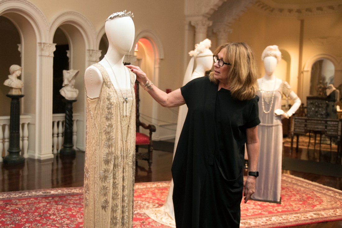 Nancy Lawson, costume specialist and co-curator of “Dressing Downton: Changing Fashions for Changing Times,” discusses the details of an original gown worn by character Freda Dudley Ward in season four of “Downton Abbey” during a media preview of the long-awaited exhibition in the Grand Ballroom Gallery of the Lightner Museum on October 3, 2017. The exhibition features 36 original costume pieces from the show, displayed alongside intricately crafted furnishings and art from Otto Lightner’s original collection of the same time period. The exhibit opens today, October 4, 2017 and runs through January 7, 2018. (Christina Kelso/ The St. Augustine Record)