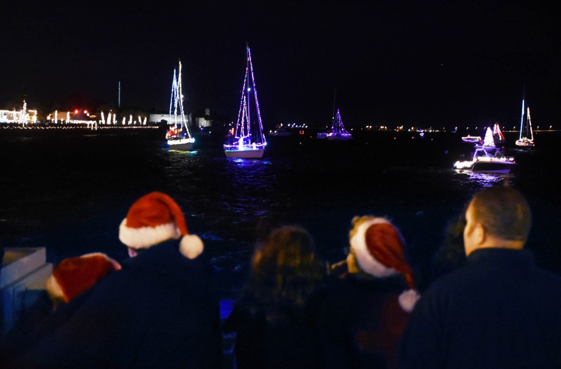 Santa hat clad spectators view the St. Augustine Yacht Club’s 36th annual Regatta of Lights from the Bridge of Lions on Saturday, December 10, 2016. (Christina Kelso/ The St. Augustine Record)