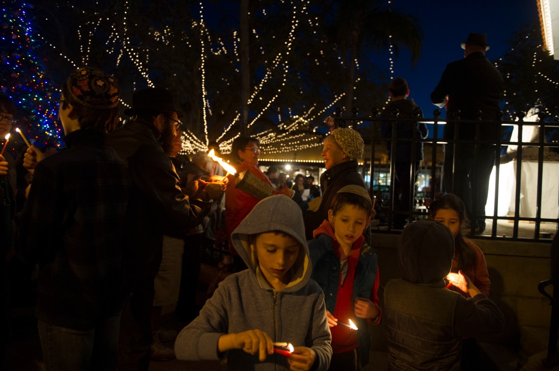 Children light candles in the Plaza de la Constitucion on Wednesday, December 13, 2017, at Chabad of St. Augustine’s 11th annual public Hanukkah celebration on Wednesday, December 13, 2017, the second day of Hanukkah. (Christina Kelso/ The St. Augustine Record)